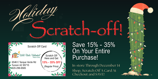 Stop by the store Now thru 12/14/25 and receive a scratch-off card containing a discount of 15% to 35% off the regular price of your entire purchase! No peeking, though! The offer is only valid when revealed at checkout. It's just our way of having a little fun while you save on gifts for friends, family and your birds!