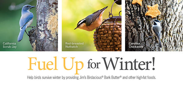 You can help by providing high-fat foods like Jim's Birdacious® Bark Butter®, Bark Butter Bits and Bugs & Bits®. Shop now and save on a variety of high-fat, fresh products - they're perfect for providing your birds with much-needed nutrients.