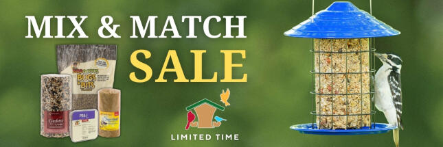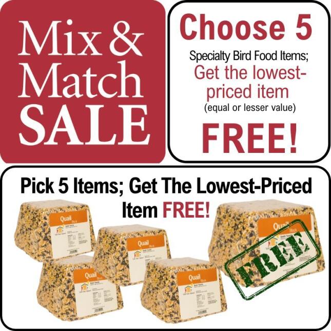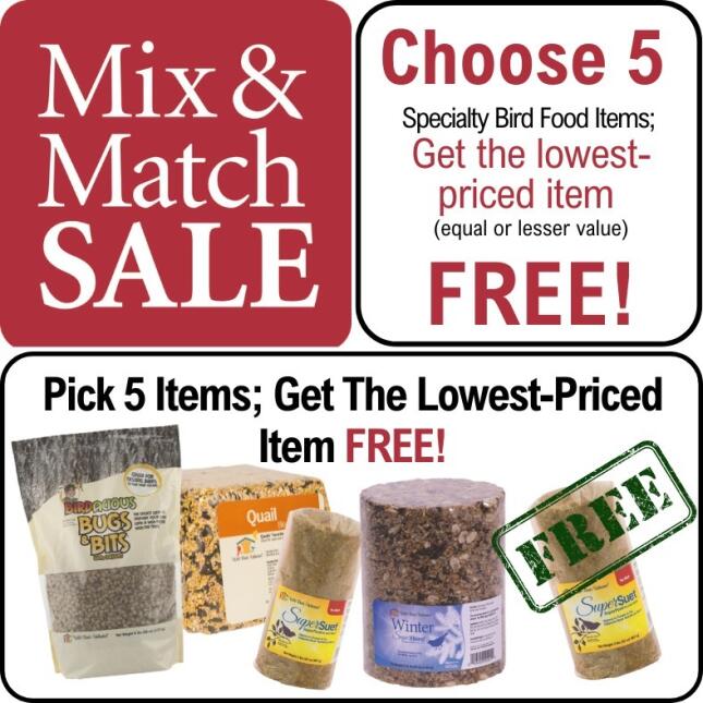 Take part in our Mix & Match Specialty Bird Foods Sale! When you buy any 5 items from our eligible groups of high-fat bird foods, you'll receive the lowest-priced item FREE.